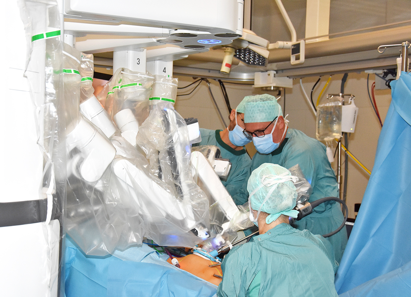 Schließlich bietet die Roboterassistenz den Operateur*innen durch die 3D-Optik bessere Sicht, etwa bei der Entfernung von Lymphknoten und der Herstellung von Verbindungen in diesem anatomiebedingt schwierigen Umfeld. Je nach Organ gibt es weitere Vorteile, so kann z. B. bei Teilentfernungen der Bauchspeicheldrüse („Pankreaslinksresektion“) die Milz unter bestimmten Umständen erhalten bleiben.