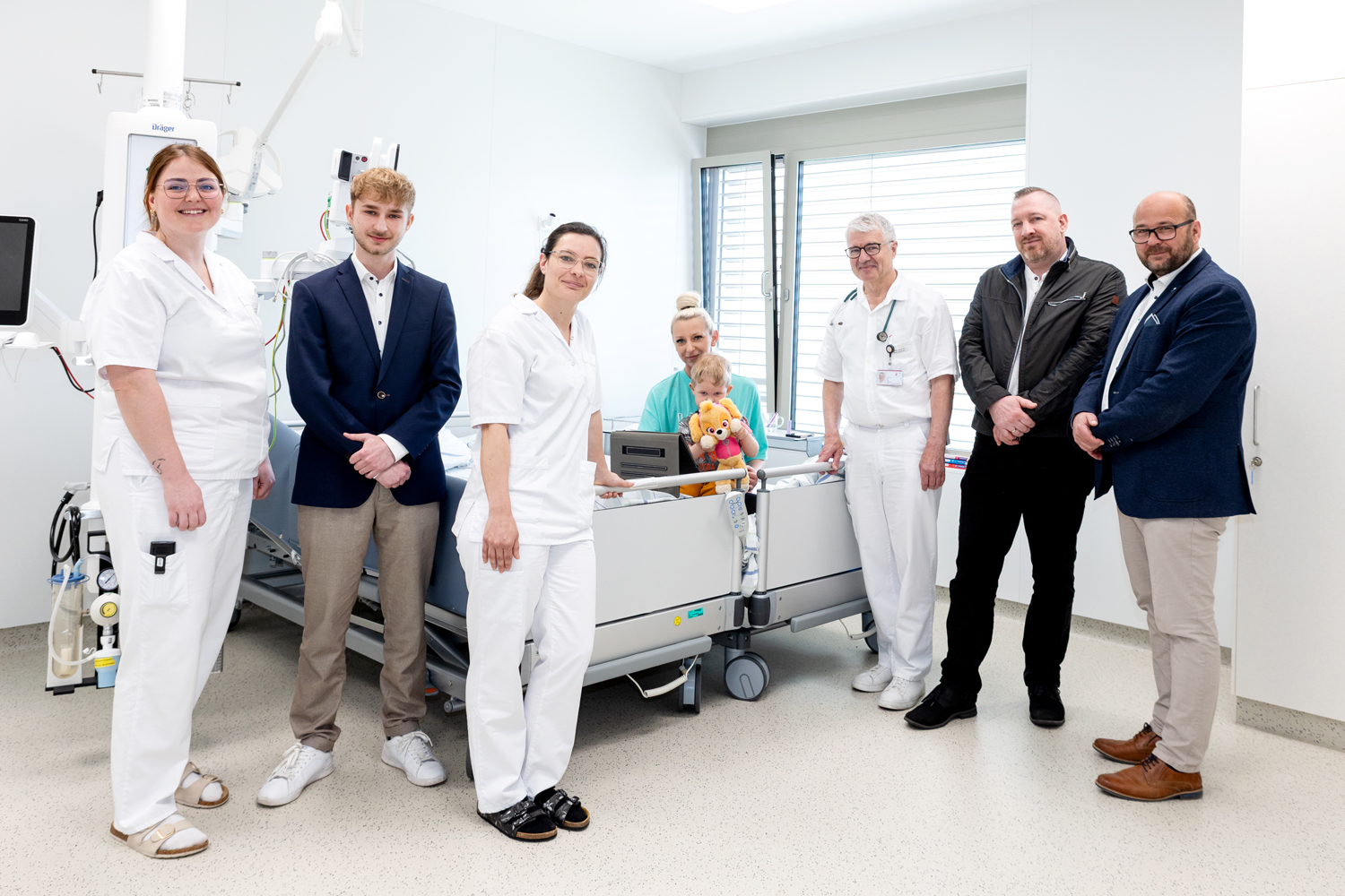 von links: DGKKP Lisa Gimpel (Bereichsleitung Kinderstation), Jonas Felber (FIVOinvest), DGKKP Kerstin Zue (Bereichsleitung Kinderstation), ein kleiner Patient mit seiner Mutter, Prim. Prof. Dr. Uwe Wintergerst (Leiter der Abteilung für Kinder- und Jugendheilkunde Krankenhaus Braunau), Rene Koder (MR-Immobilien) und Thoms Waltl (FIVOinvest).