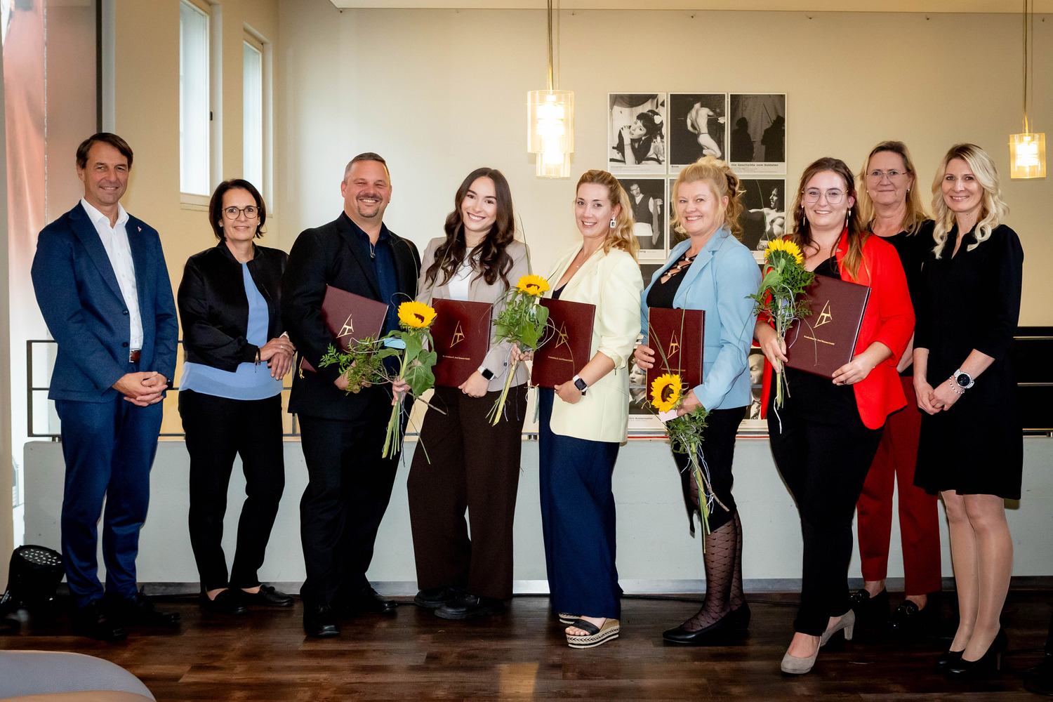 Die Absolventinnen und Absolventen mit Erwin Windischbauer, MAS (Geschäftsführer Krankenhaus Braunau, links), Gerlinde Bermannschlager, MSc (Pflegedirektorin Krankenhaus Braunau, 2.v.l.), Michaela Ober, B.A. (Direktorin TAU-KOLLEG, rechts) und Gabriele Rosenlechner, MSc (Stv. Direktorin TAU-KOLLEG, 2.v.r.).